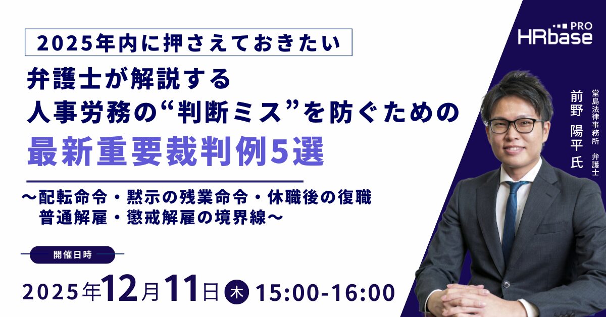 | セミナー名 | 【2025年内に押さえておきたい】弁護士が解説する人事労務の“判断ミス”を防ぐための最新重要裁判例5選~配転命令・黙示の残業命令・休職後の復職・普通解雇・懲戒解雇の境界線~ |
