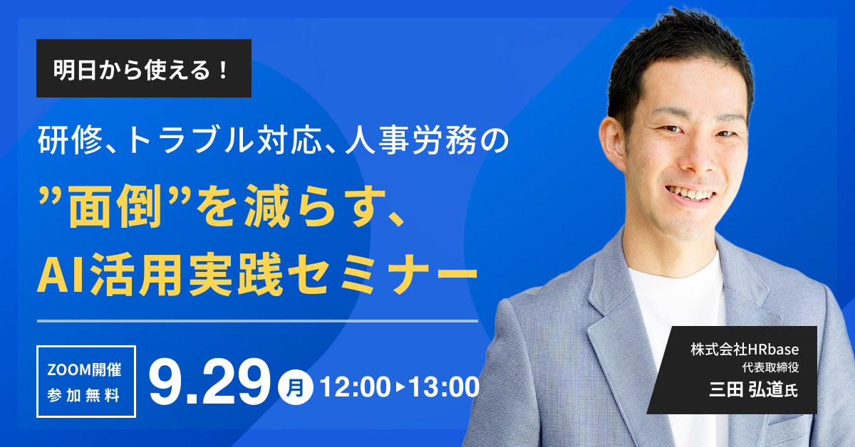 | セミナー名 | 明日から使える!研修、トラブル対応、人事労務の”面倒”を減らす、AI活用実践セミナー |