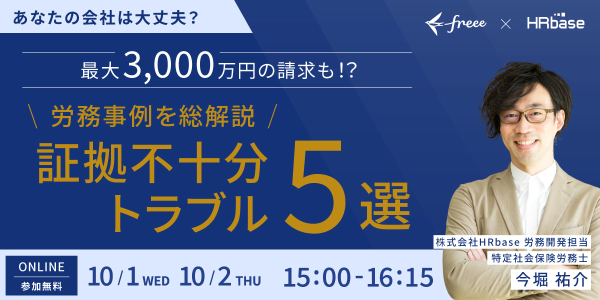 | セミナー名 | あなたの会社は大丈夫? 労務関連・証拠不十分トラブル5選 【3,000万円の請求も!?】 |