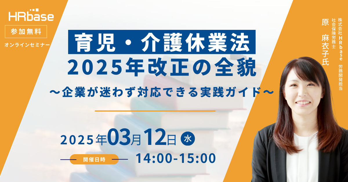 本セミナーでは、法改正の詳細、規程整備のポイント、企業が取るべき実務対応について徹底解説します。育児・介護制度の適切な運用で、リスクを軽減するためにもぜひご参加ください。