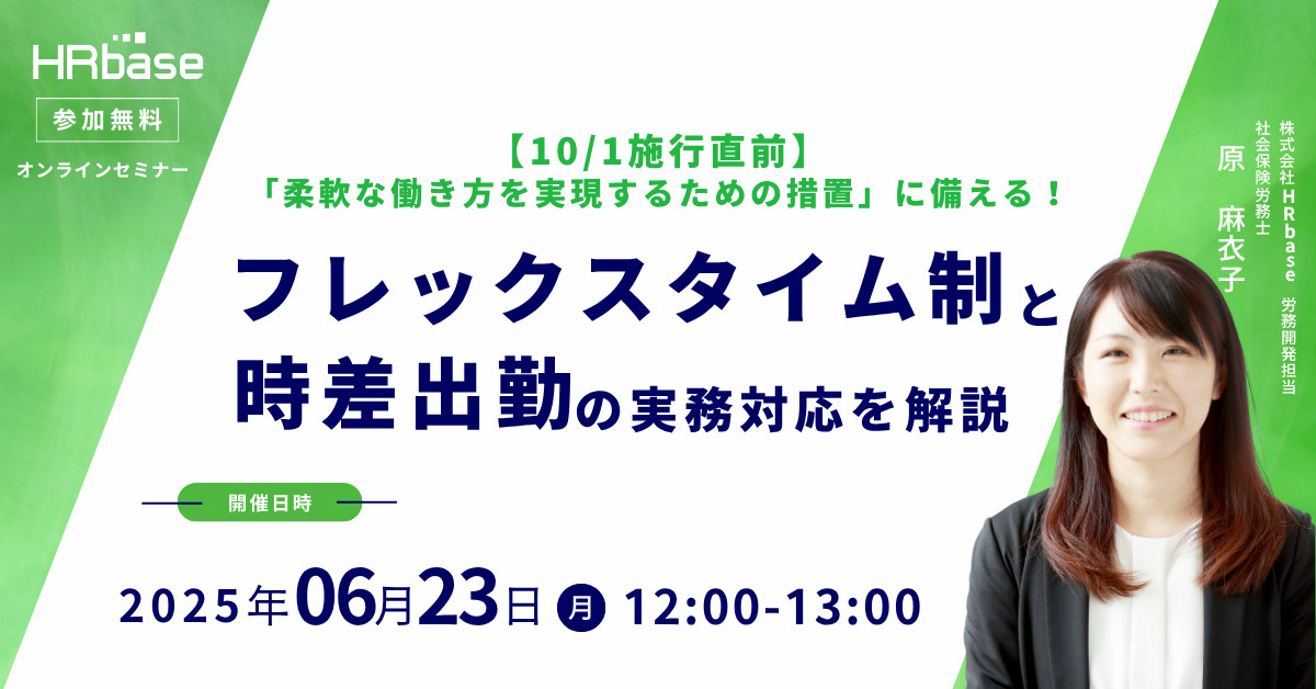 | セミナー名 | 【10/1施行直前】「柔軟な働き方を実現するための措置」に備える!フレックスタイムと時差出勤の実務対応を解説 |