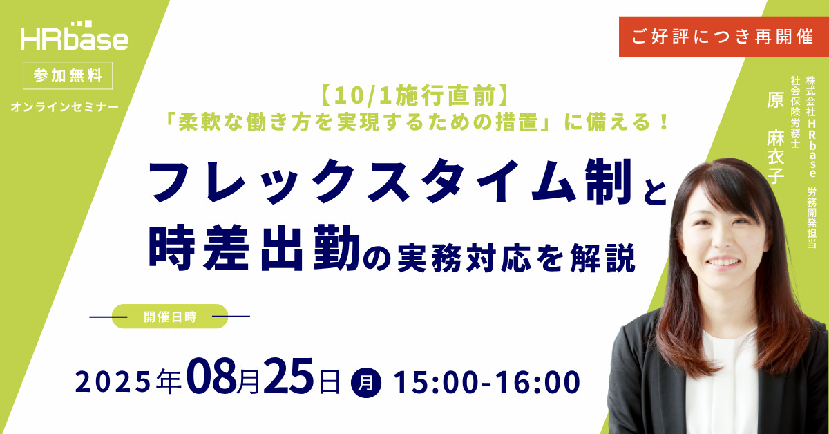 | セミナー名 | ご好評につき再開催!【10/1施行直前】「柔軟な働き方を実現するための措置」に備える!フレックスタイムと時差出勤の実務対応を解説 |