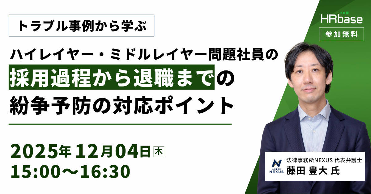 | セミナー名 | 【トラブル事例から学ぶ】ハイレイヤー・ミドルレイヤー問題社員の採用過程から退職までの紛争予防の対応ポイント |